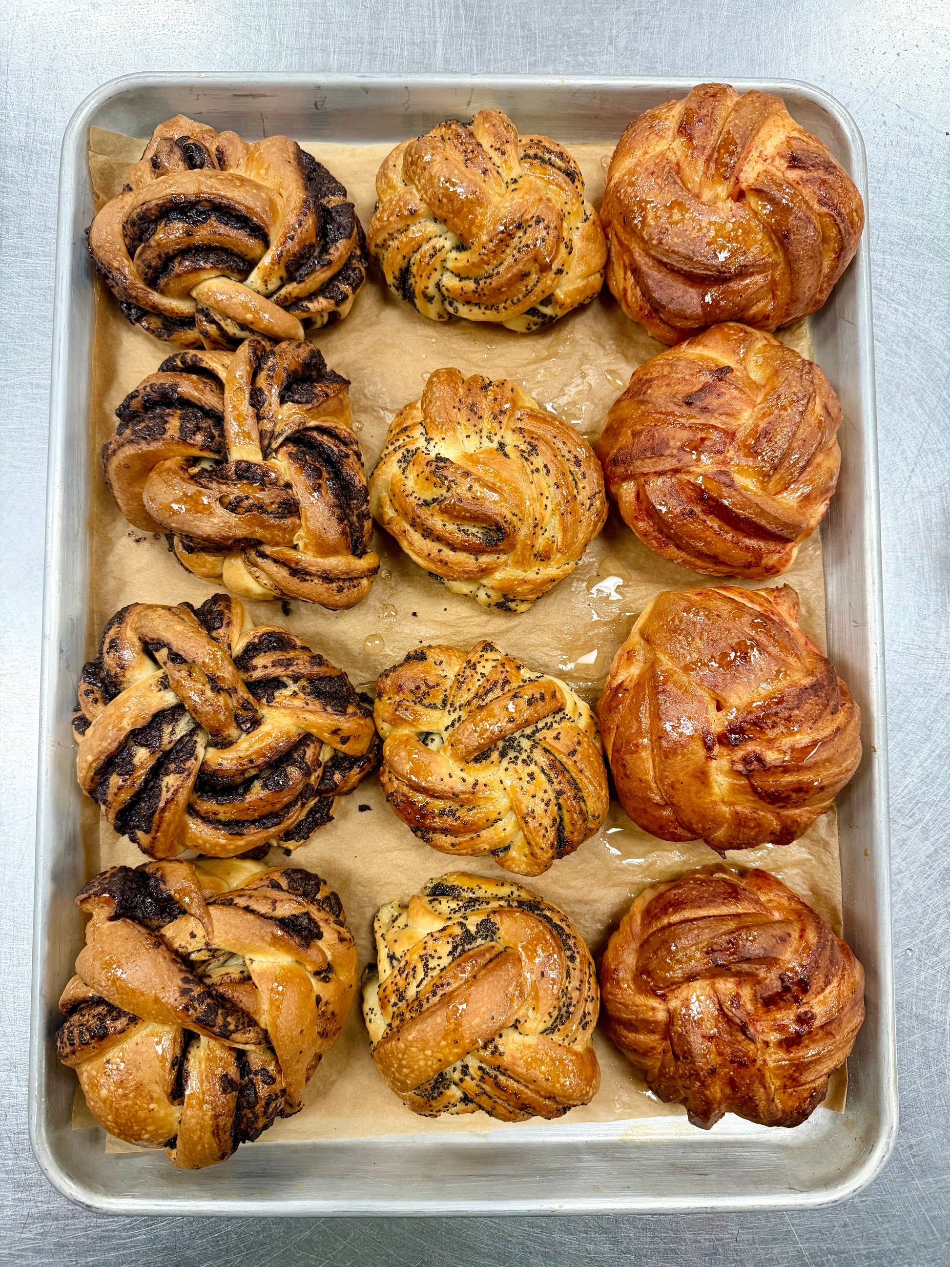 The ultimate babka sampler. This dozen includes a mix of our sweet babka rolls - perfect for gatherings, gifting, or stocking up for the week. We'll choose a balanced assortment for you, or email us at info@braidbakery.com after ordering with your preferred flavors... or flavor if you want them all the same.